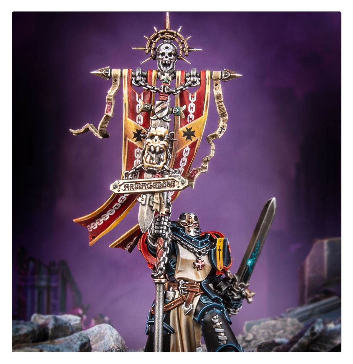 Crusade Ancients are veteran wardens and honoured warriors of exceptional resolve and determination who carry icons and sacred standards into battle. They raise high the tapestries depicting the crusade’s victories and the God-Emperor’s glory, inspiring their fellow Black Templars to greater heights of weaponised hate.