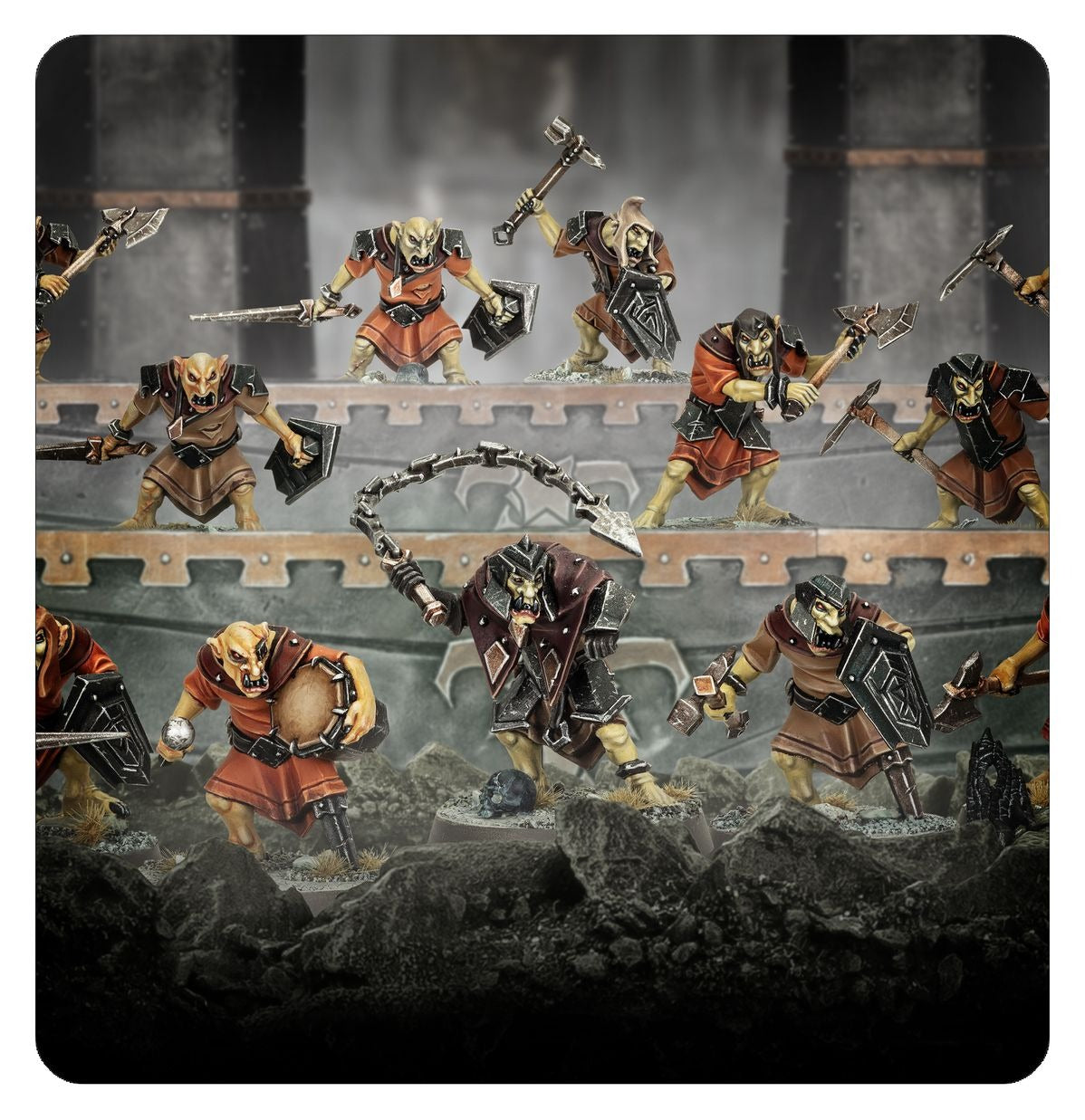 This multipart plastic kit builds 20 Hobgrot Vandalz, light infantry for your Helsmiths of Hashut armies in games of Warhammer Age of Sigmar. They are ideal for overrunning your foes, protecting vital units, and taking exposed objectives. Equipped with shields and scavenged weapons, including a mix of hammers, blades, and picks, they are ready to get stuck in. The kit also includes parts to build two optional standard bearers, musicians, and champions armed with your choice of dagger or chain weapon.