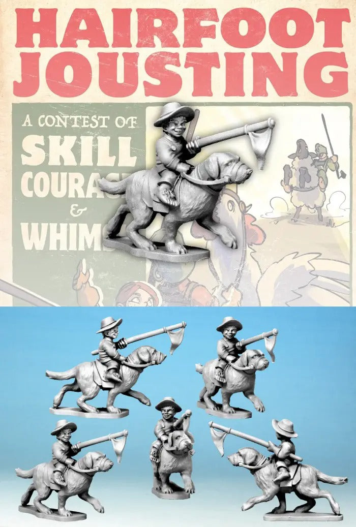 Hairfoot Jousting is a quick and simple tabletop miniatures game in which players seek to lead their teams of three to victory in tournaments or over the course of a season. Play on some of the most famous pitches to grace the sport, such as Baker's Run, The Puddles, and Barrel Bottom, each with their own special challenges. Point your jousters in the direction of their opponents and hope their mounts don't have their own ideas! In Hairfoot Jousting, sportsmanship and a sense of humour are as valuable as skill or luck – after all, it's joust a bit of fun.