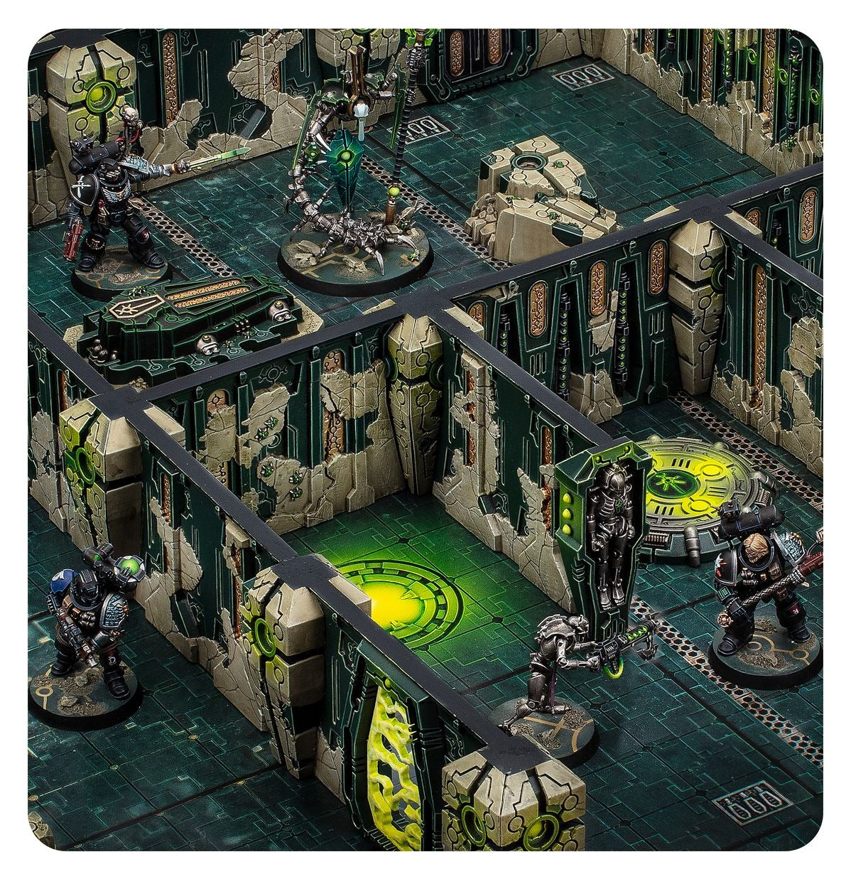 The Tomb Worlds of the Necrons are eternal mausoleums composed of strange xenos machinery. Within their labyrinthine corridors, you'll find teleport pads, deactivated Necron warriors, and a great many sarcophagi containing dormant Necrons and their constructs.