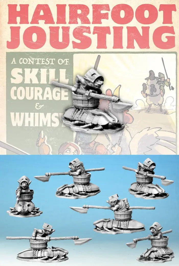 Hairfoot Jousting is a quick and simple tabletop miniatures game in which players seek to lead their teams of three to victory in tournaments or over the course of a season. Play on some of the most famous pitches to grace the sport, such as Baker's Run, The Puddles, and Barrel Bottom, each with their own special challenges. Point your jousters in the direction of their opponents and hope their mounts don't have their own ideas! In Hairfoot Jousting, sportsmanship and a sense of humour are as valuable as skill or luck – after all, it's joust a bit of fun.