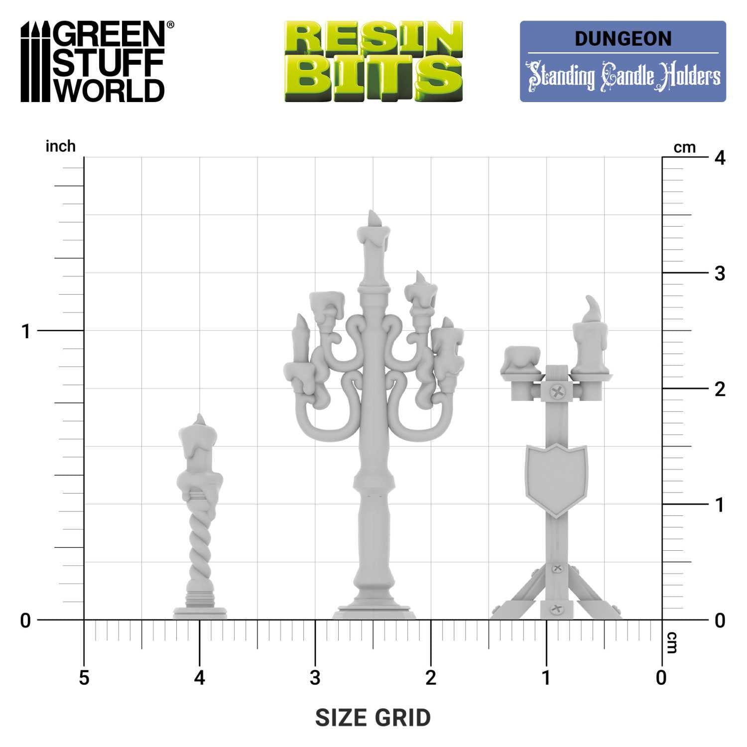 Set of resin bits: Standing Candle Holders with candles. A perfect accessory to bring life to castle interiors, arcane libraries, dungeons, or gloomy taverns. Each piece has been designed with a high level of detail, accurately capturing every relief of the different candelabras, the melted candle wax, and the shapes of the flames.