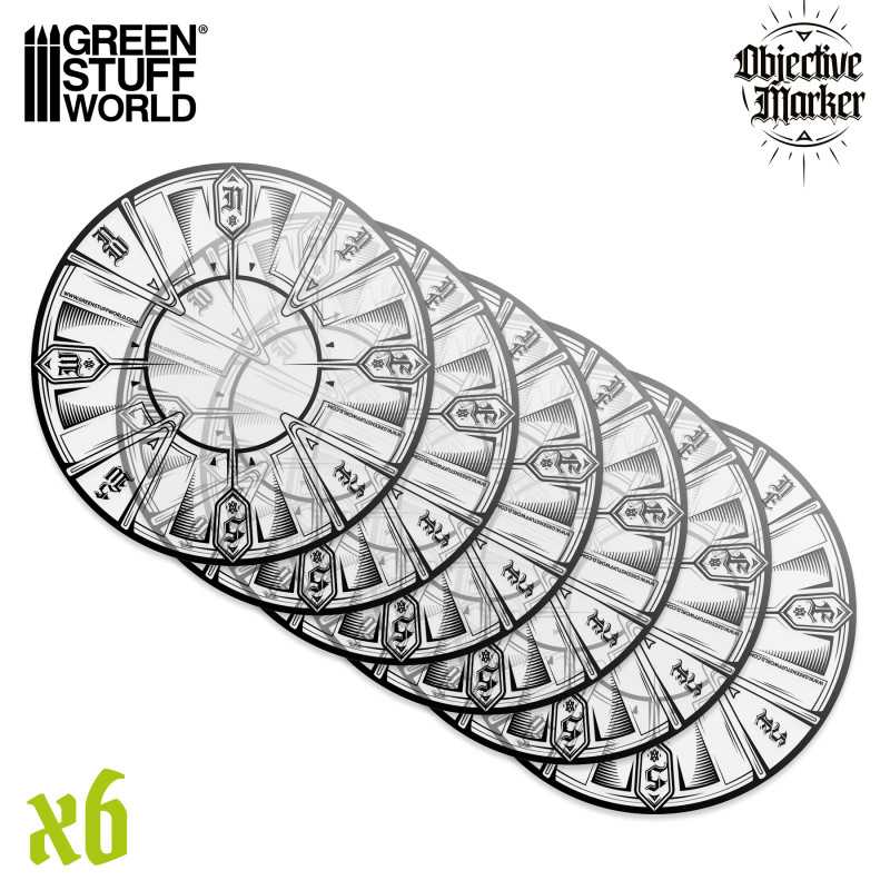 Green Stuff World's Mission Objective Markers are ultra-slim, transparent circles with colored printing, just 1 mm thick, designed to be compatible with pinpoint scoring spots on any Warhammer® Kill Team killzone. Each pack gives you six tokens: a 40 mm hub (inner size) plus a double 1+1″ ring — effectively a 2″ control halo — all in flexible, shatter-proof glasspack plastic.