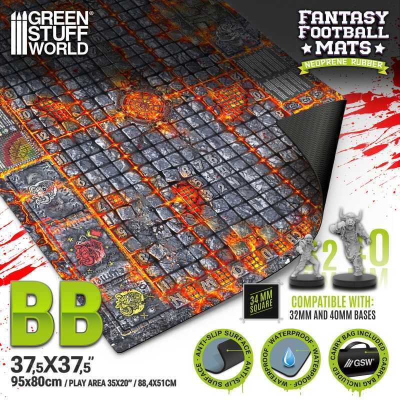 The neoprene Fantasy Football mats from Green Stuff World are designed to be fully compatible with Fantasy Football games and especially useful as Blood Bowl mats. Each playmat includes all the essential features for smooth gameplay: integrated dugouts, a printed kick-off table, passing ranges, and Nuffle tables—everything you need for fast and competitive matches.
