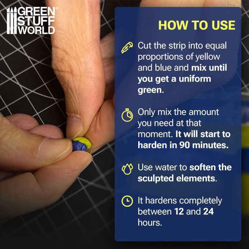Mixing at 50/50% or 60/40% of the yellow 'filler' and blue 'hardener' produces a sticky green putty that feels a lot like chewed bubble gum. Once mixed, it has a worklife of 90 minutes, allowing time for shaping and detailing, reaching 'ultimate hardness' after 24 hours. Altering the mix with a more blue or yellow component will produce a faster/slower and harder/softer cure.