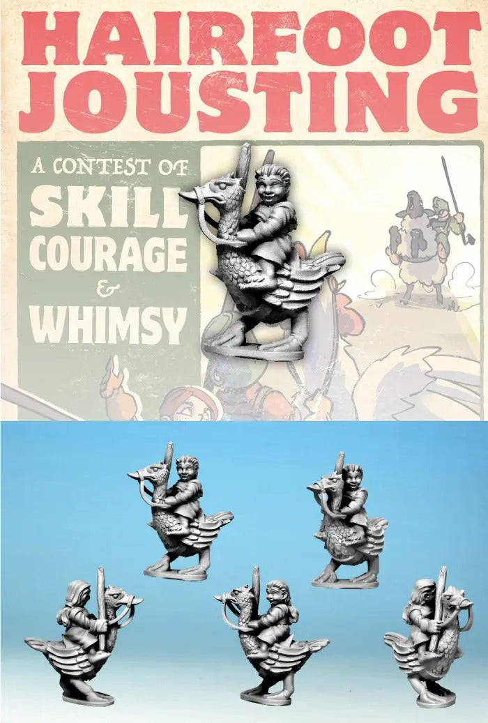 Hairfoot Jousting is a quick and simple tabletop miniatures game in which players seek to lead their teams of three to victory in tournaments or over the course of a season. Play on some of the most famous pitches to grace the sport, such as Baker's Run, The Puddles, and Barrel Bottom, each with their own special challenges. Point your jousters in the direction of their opponents and hope their mounts don't have their own ideas! In Hairfoot Jousting, sportsmanship and a sense of humour are as valuable as skill or luck – after all, it's joust a bit of fun.