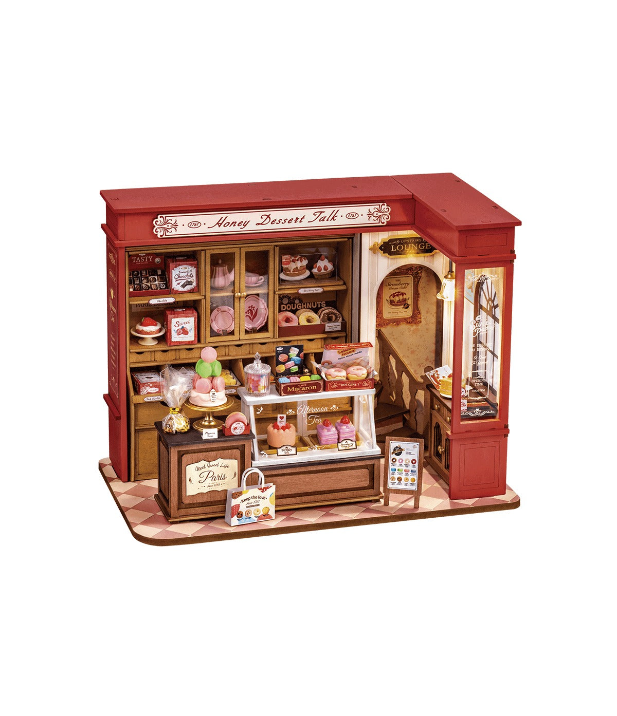 It’s time for tasty treats from Honey Dessert Talk, a sweet and stylish French pâtisserie by Rolife. This DIY miniature is filled with delectable creations artfully displayed in charming glass cases and wooden shelves. Add this adorable model to your miniature house collection today!
