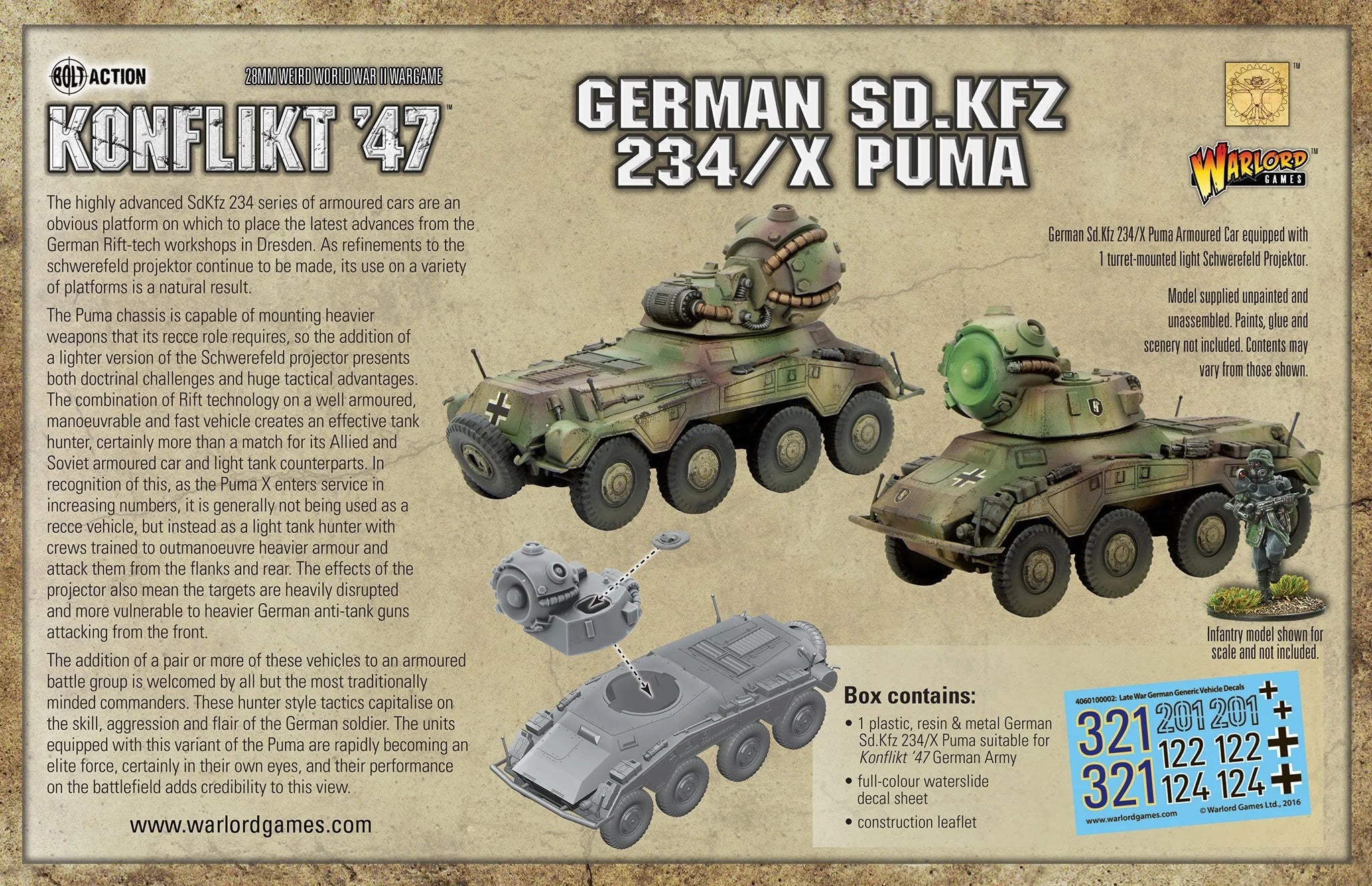 - 1 plastic, resin & metal German Sd.Kfz 234/X Puma suitable for Konflikt ‘47 German Army.