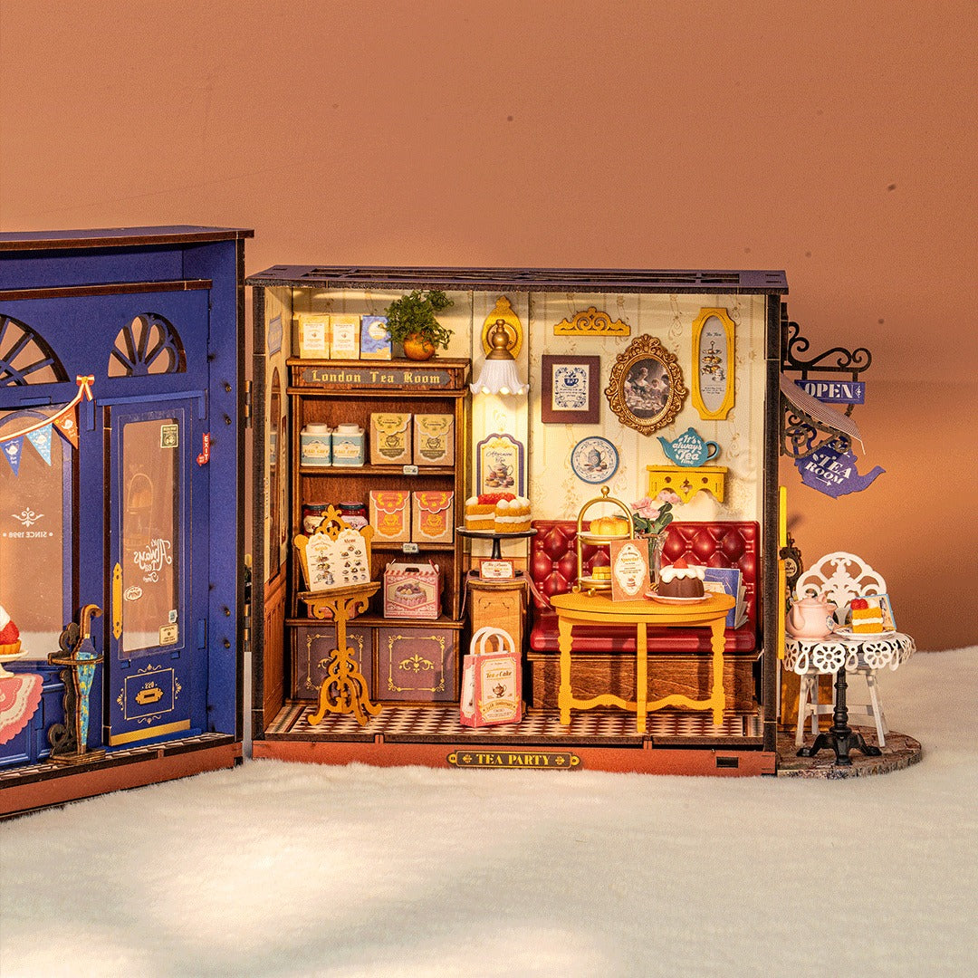 Come and take a delightful escape into a world of hobbies and craftsmanship with Rolife Leisure Time Tea Room DIY miniature house. Open the door and pass through the vibrant blue facade that turns heads and invites passersby in, then inhale the sweet aroma of freshly brewed tea and coffee.
