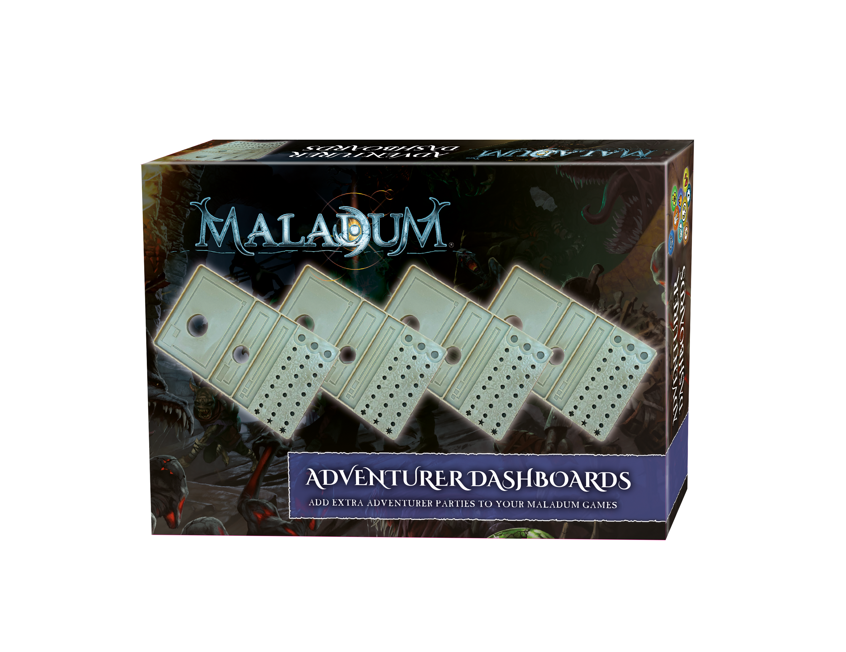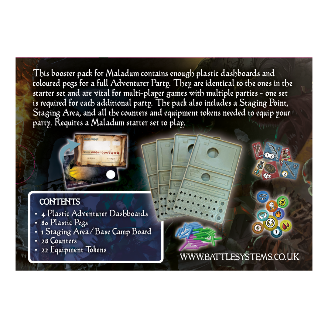 This booster pack for Maladum contains enough plastic dashboards and coloured pegs for a full Adventurer Party. They are identical to the ones in the starter set and are vital for multi-player games with multiple parties–one set is required for each additional party.