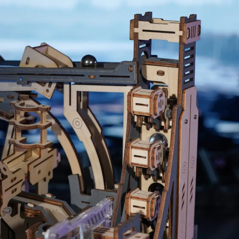 Get ready for a whole new visual feast! This is a marble run model, which is designed in dark gray and dotted with silver. The product of ROKR Track Maze City, Marble Spaceport (LGC01) was born with the theme of future space technologies. The uniqueness of this marble run lies in its complex mechanical structures, which are 6 diversion mechanisms and 5 tracks. Turning the handle, you can watch steel balls rolling through different tracks.