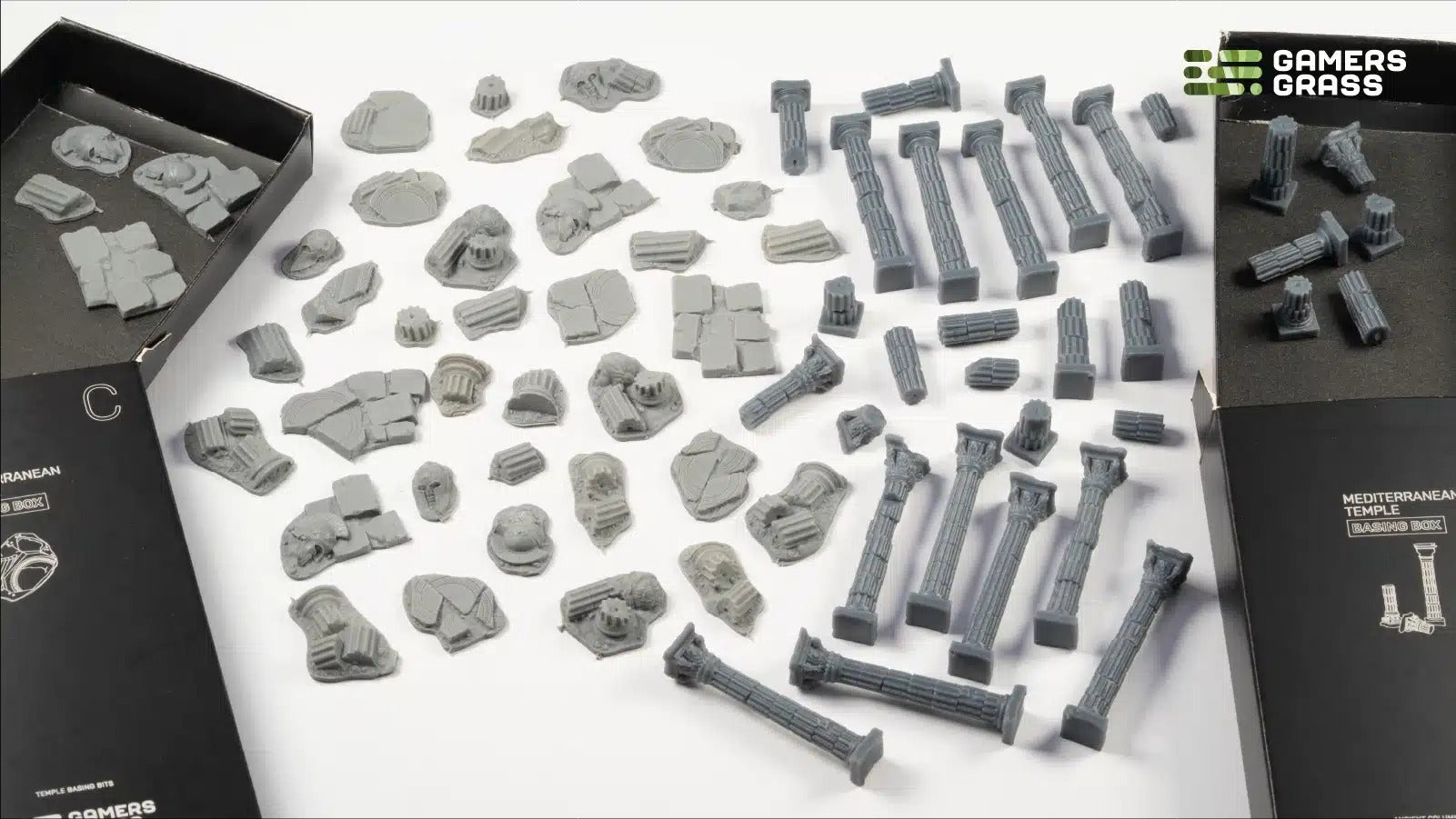 The Mediterranean Temple Basing Box will take your miniatures to the ruins of an epic bygone temple! A site where echoes of heroic deeds and old gods still cling to the ancient stone structures and oxidized bronze statues. Corynthian and Doric pillars lie surrounded by mediterranean olive shrubs and other dry flora – some still stand, while others have fallen, assaulted by Time itself. Here, the dry air and quietness should not be disturbed, lest your forces suffer ancient curses or singing spells.