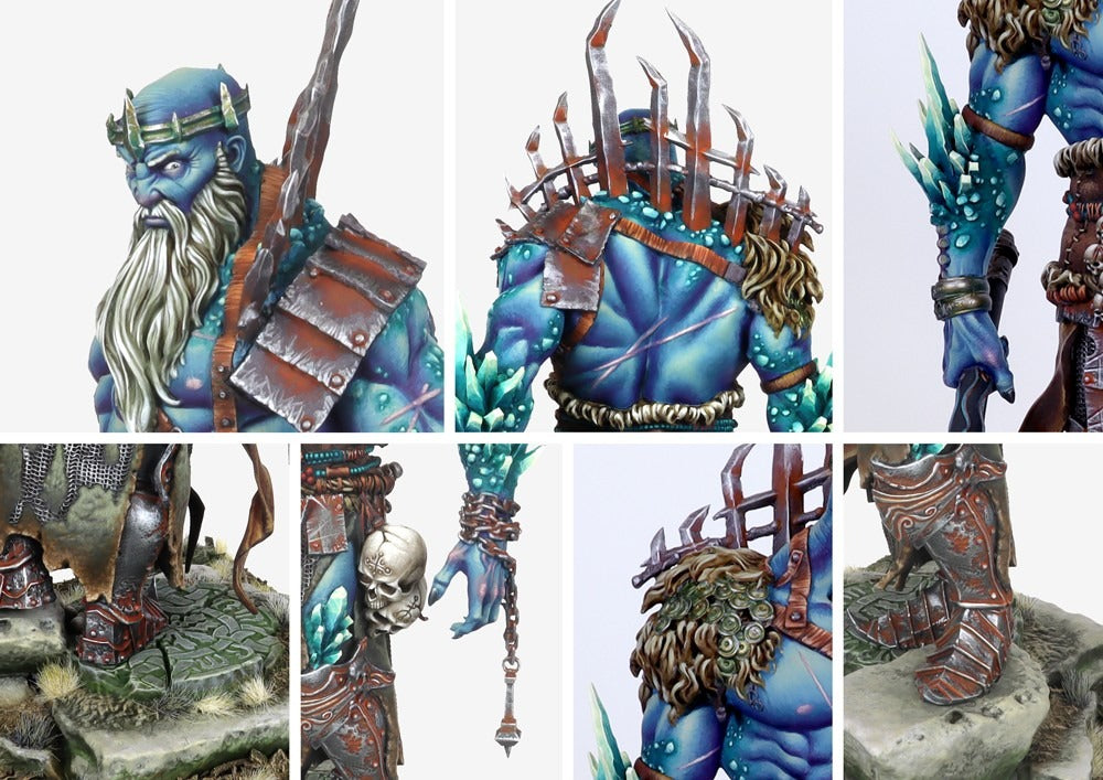 Few and far in between, Ice Jotnar are the nobility of their kind and the most powerful of the Jotuns. Gifted with an innate mastery over storm and ice, their massive forms are sheathed in heavy ice and rime allowing them to wade into battle unscathed while conjuring jagged shards of ice from thin air to hurl at their foes until they close distance with their hapless foe. Sapped of his strength and vitality by the aura of unnatural cold that wreathes their titanic forms, foes are easy prey to these massive warriors.