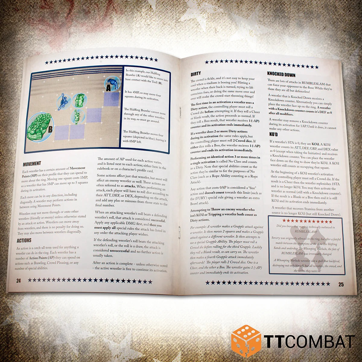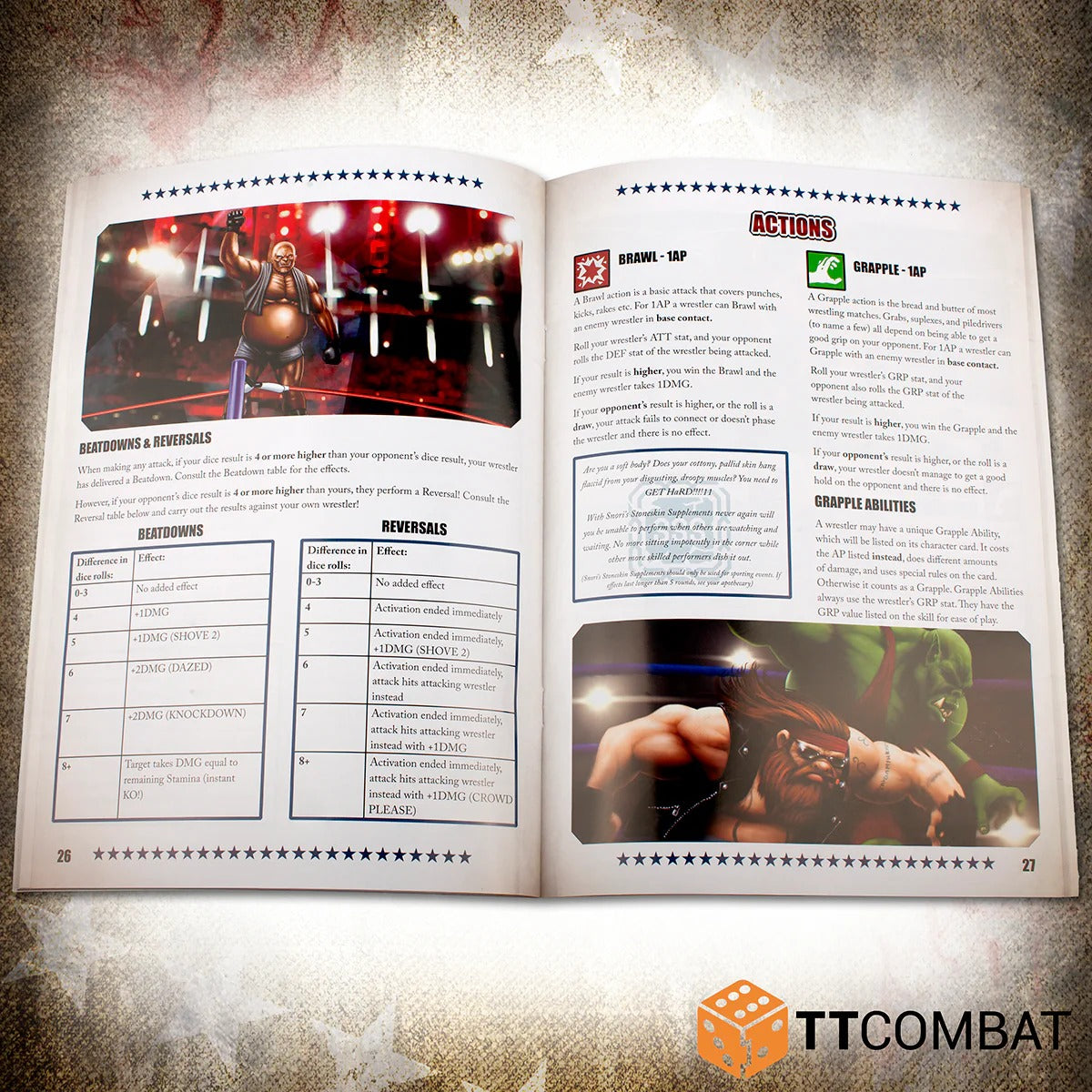 RUMBLESLAM 2nd edition rulebook – the complete 48-page book filled to the brim with wrestling fun! There are sections on each casino in RUMBLESLAM, and plenty of gorgeous pieces of artwork. This new edition makes several key tweaks to gameplay to give a more well-rounded experience and make every wrestler as useful as the next. Plus fan-favourite pinning rules are here!