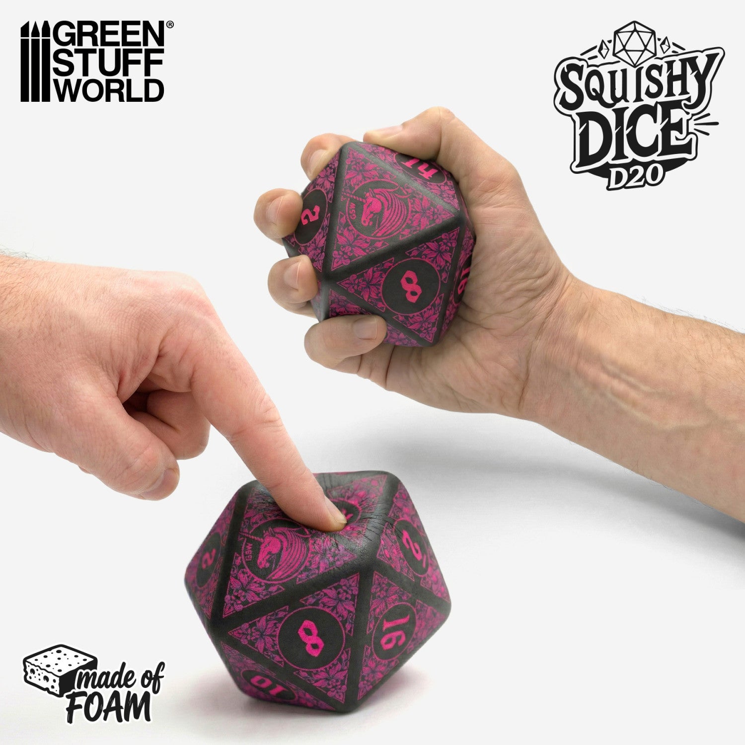 Green Stuff World's Squishy D20 Dice is the perfect accessory for any fan of role-playing games, wargames, and geek culture in general. Made of soft-touch injected foam, it combines bold colors and themed decoration to become a fun piece for both your desk and your gaming table.