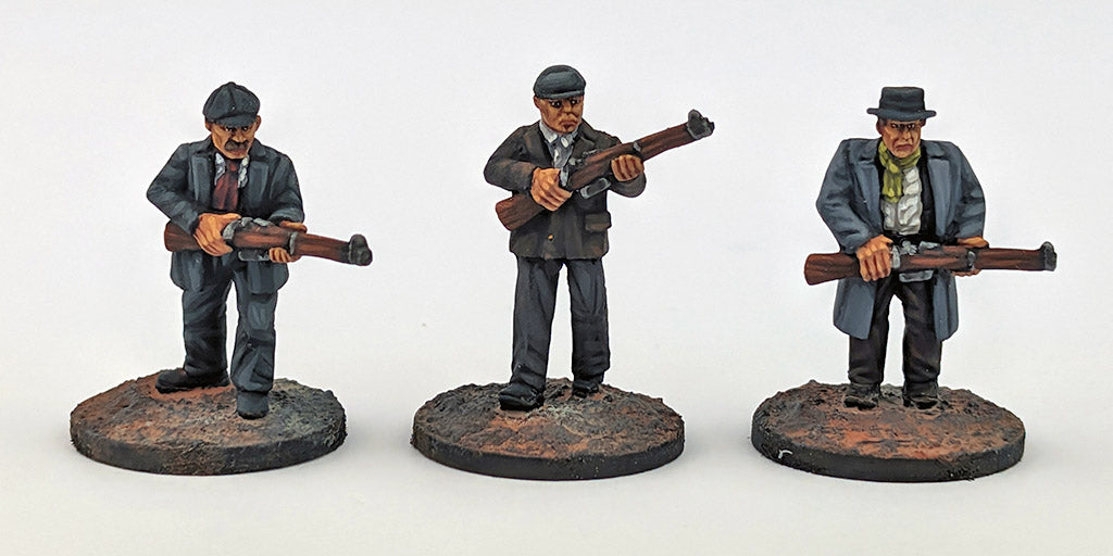 More Peaky Blinders. Left to Right: Jonny, Barney, Charlie. 3 x 28mm miniatures. Metal. Unpainted. Bases supplied. Lees meer