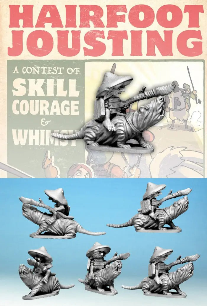 Hairfoot Jousting is a quick and simple tabletop miniatures game in which players seek to lead their teams of three to victory in tournaments or over the course of a season. Play on some of the most famous pitches to grace the sport, such as Baker's Run, The Puddles, and Barrel Bottom, each with their own special challenges. Point your jousters in the direction of their opponents and hope their mounts don't have their own ideas! In Hairfoot Jousting, sportsmanship and a sense of humour are as valuable as skill or luck – after all, it's joust a bit of fun.